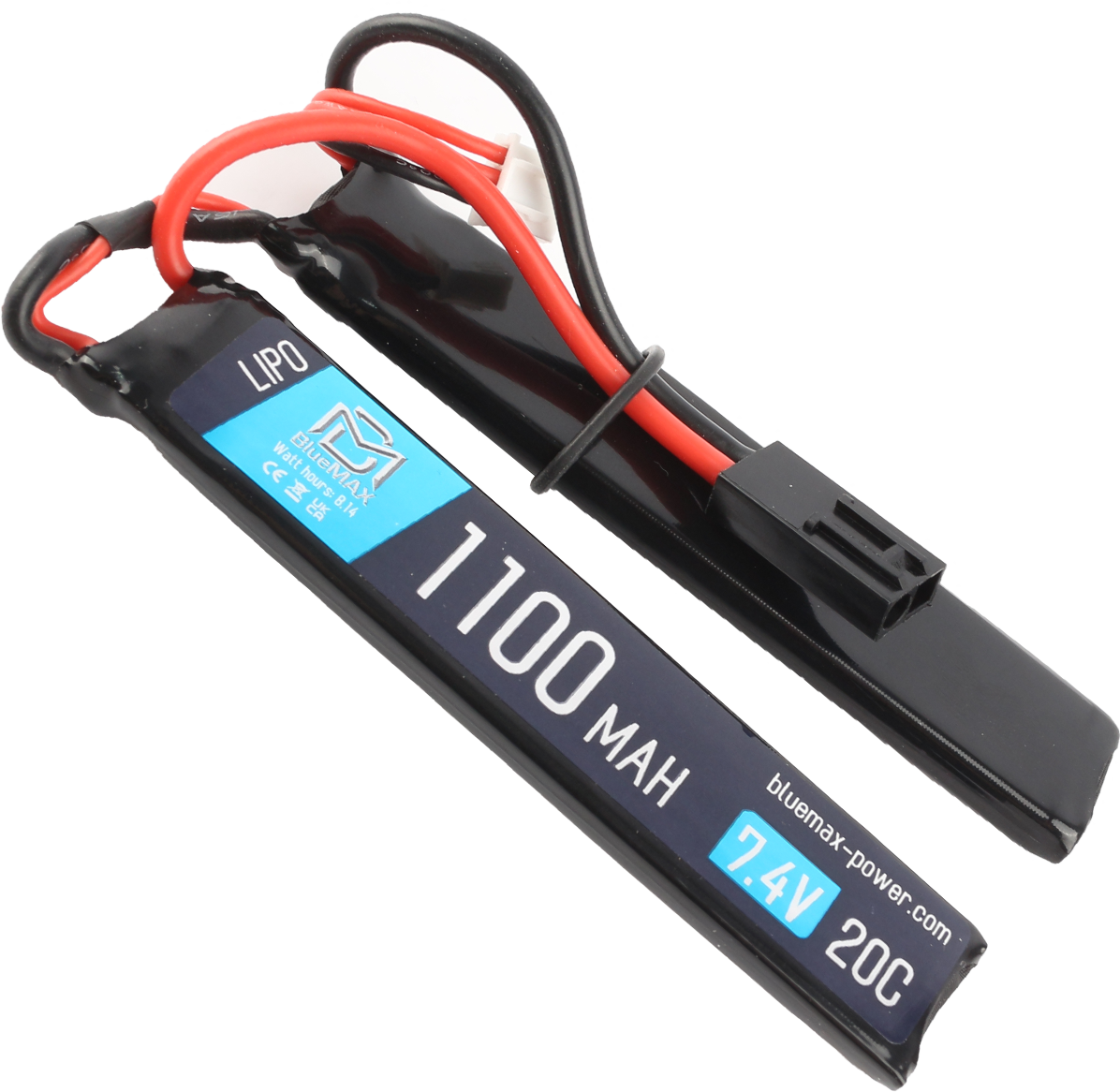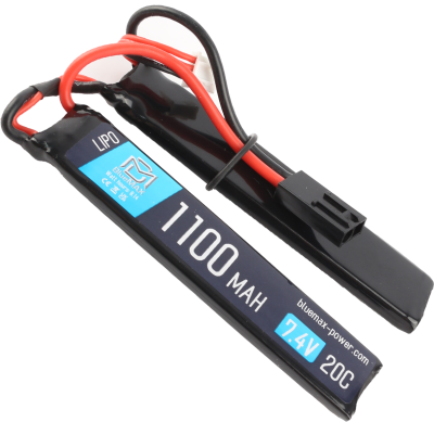 <p>Двухлепестковая литий-полимерная аккумуляторная батарея производства компании Bluemax. Отличный выбор по соотношению критериев цена/качество. Емкость АКБ составляет 1100 мАч. Не самая высокая емкость, однако позволяет сделать элементы питания максимально тонкими, так что аккумулятор может быть установлен в небольшой отсек, где место ограничено (например цевье пистолета-пулемета MP5, карабина M4, труба приклада crane stock). Напряжение в 7.4 Вольта способно без потерь в скорострельности справится с номиналом пружины до SP120. Для подключения к проводке привода используется разъём mini tamiya.</p>