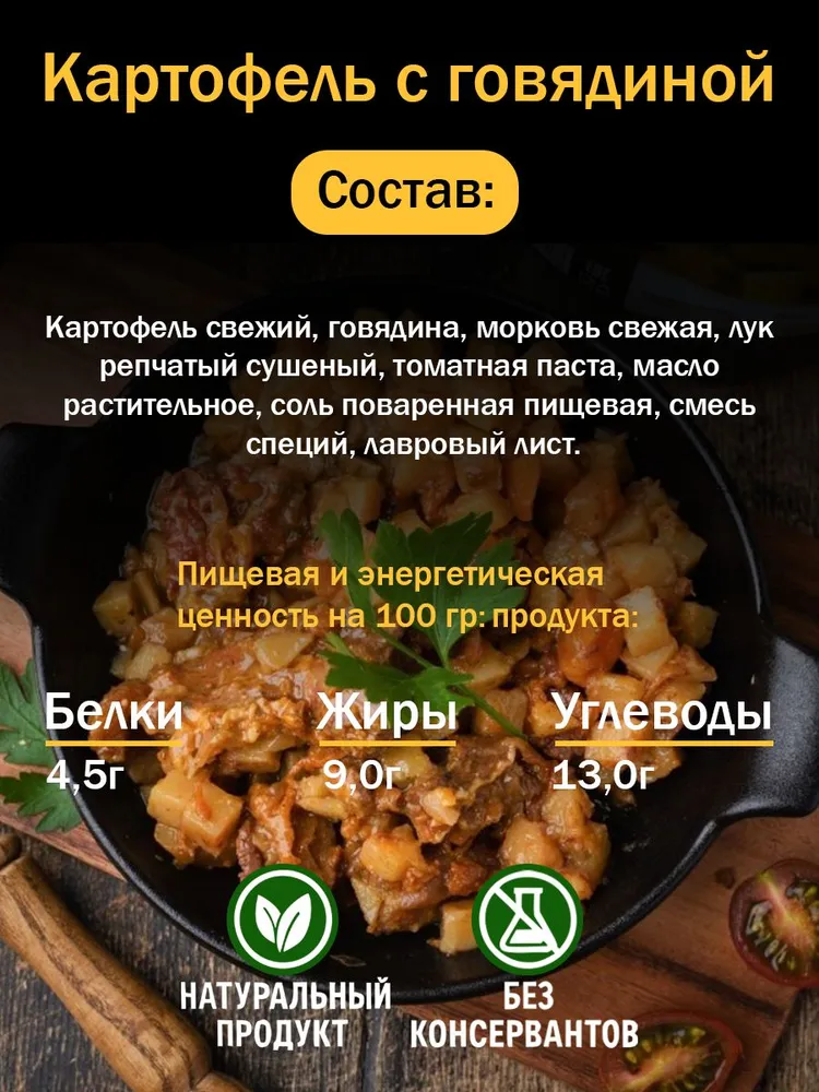 Картофель свежий, говядина, морковь свежая, лук репчатый сушеный, томатная паста, масло растительное, соль поваренная пищевая, смесь специй, лавровый лист.
