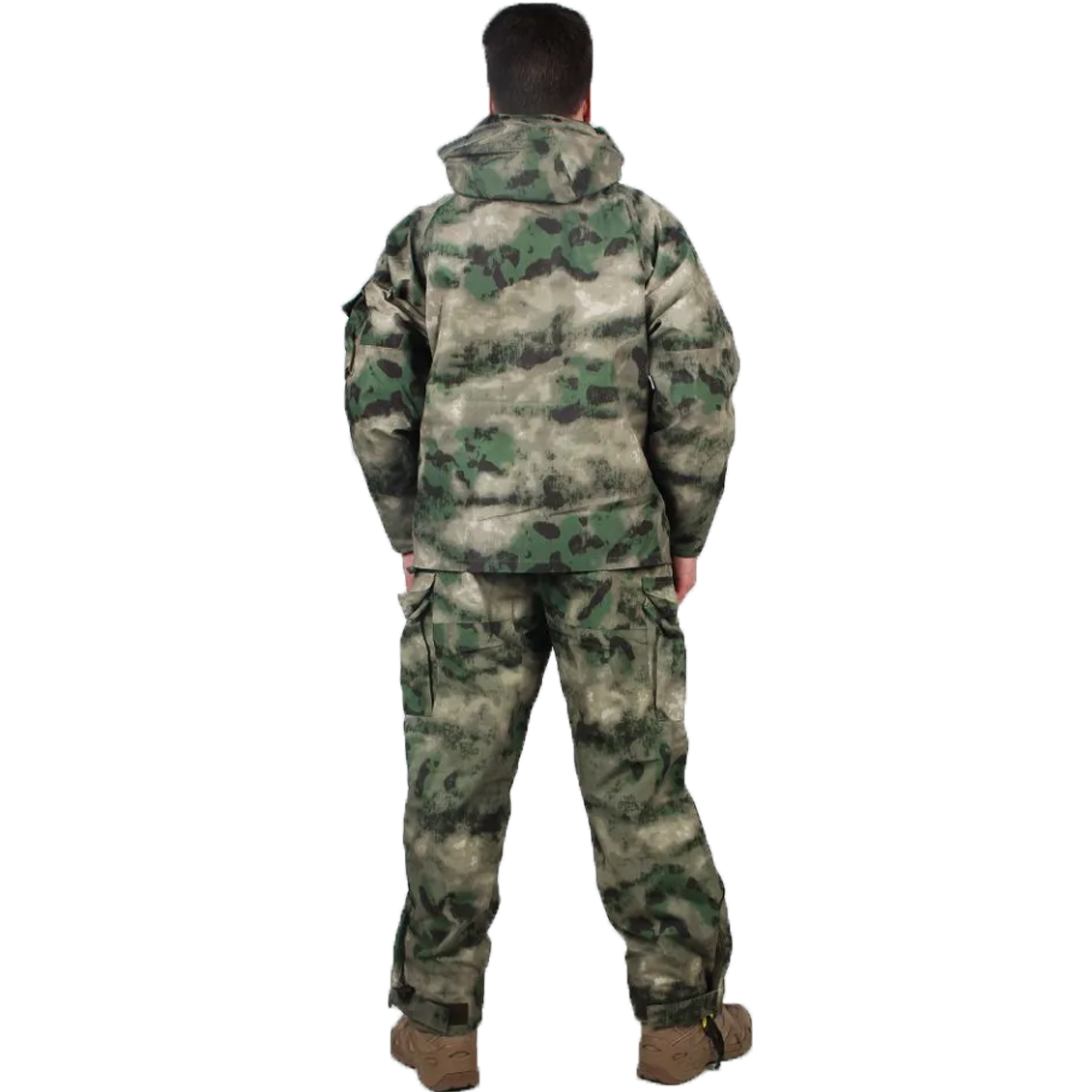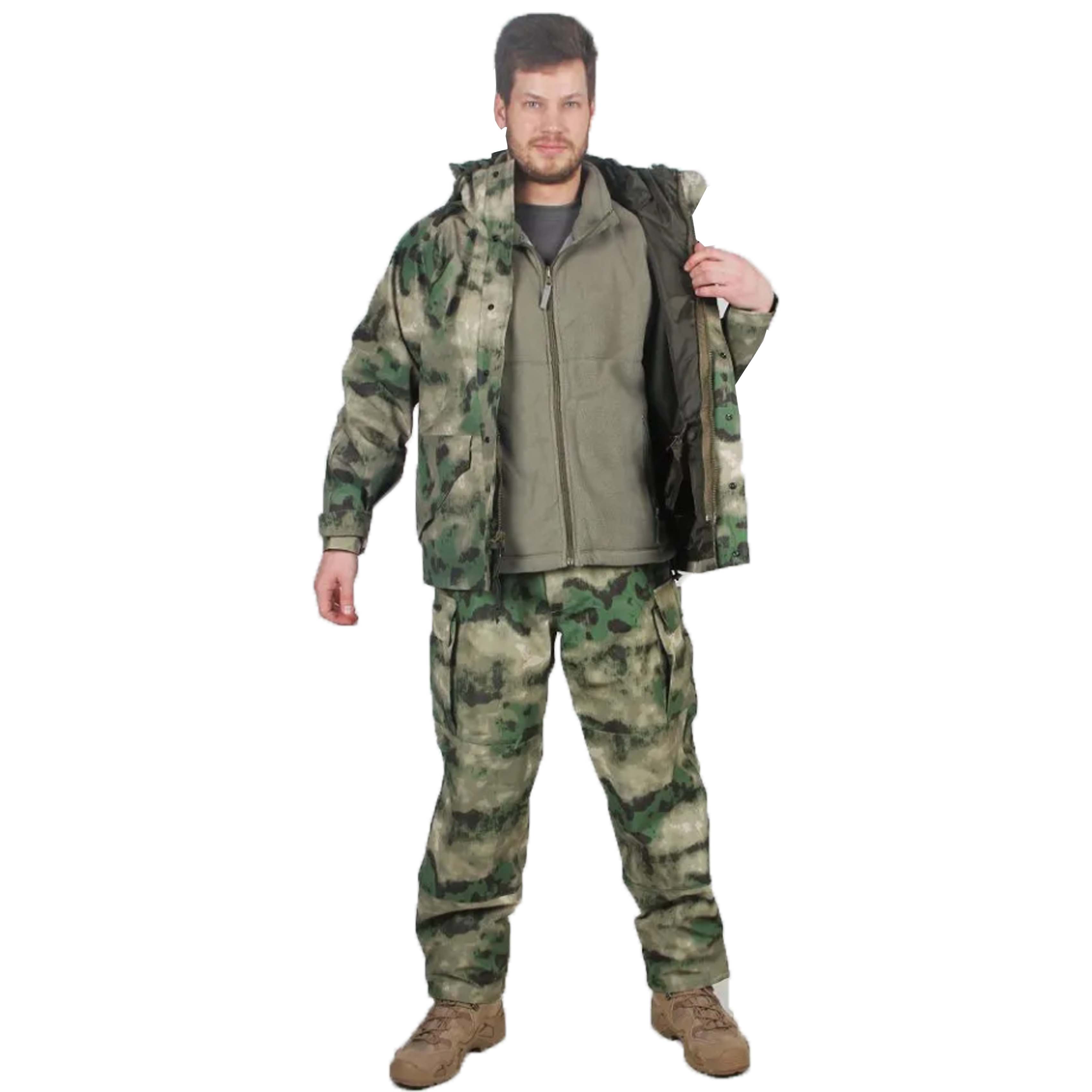 Применена 2-х слойная ткань, обеспечивающая отличную защиту от воды и ветра, но паропроницаемая. Ткань выполнена по технологии Ripstop. А флисовый подклад куртки и брюк позволяют носить данный комплект до -30 градусов Цельсия.