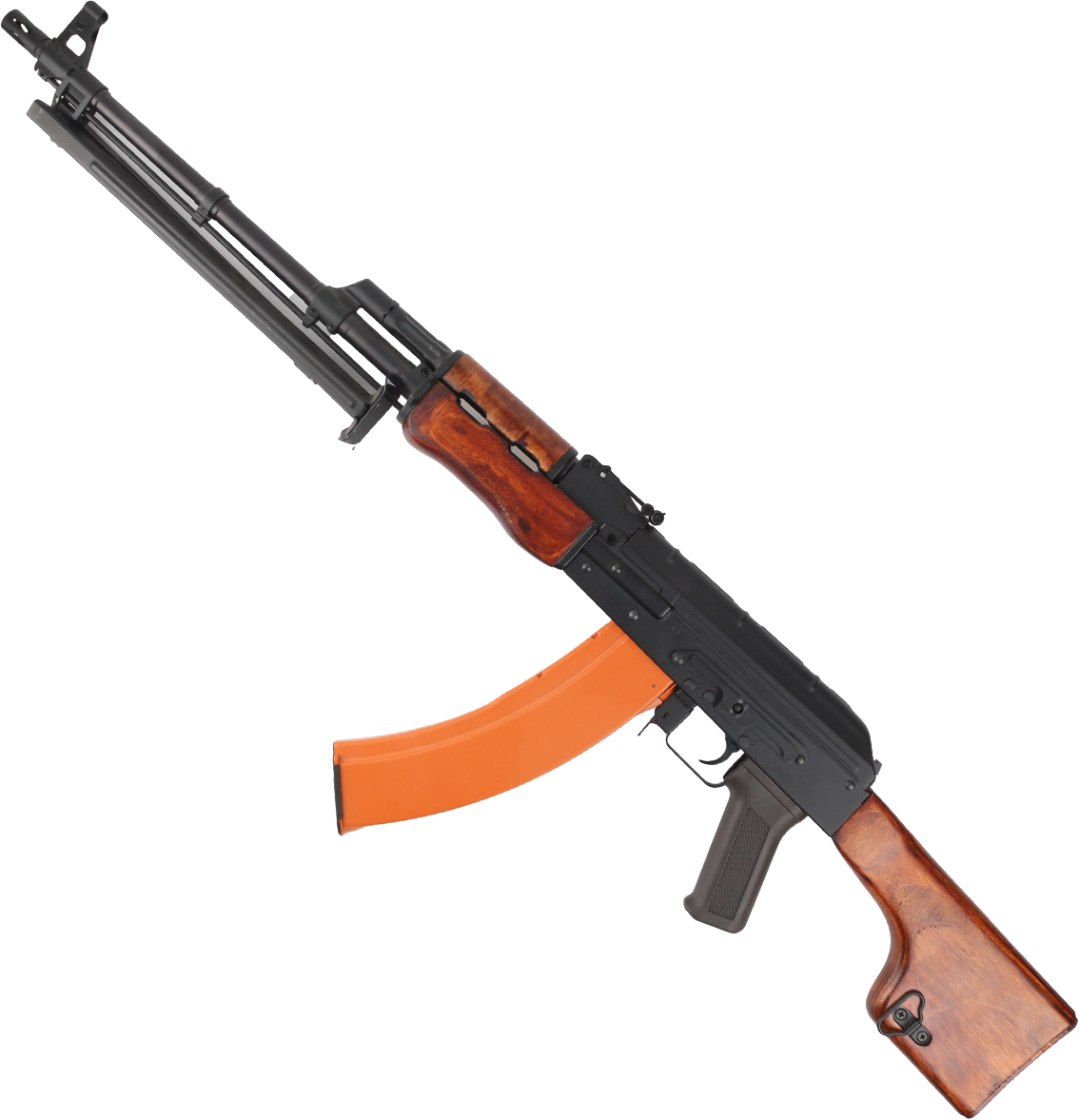 Страйкбольный пулемет РПК CM052 от производителя Cyma — это мощный электропривод, выполненный с точным соблюдением масштаба 1:1 настоящего образца. Корпус пулемета, ствол и сошки выполнены из металла, а приклад и цевье — из высококачественного натурального дерева, что придает оружию аутентичный вид и высокую прочность. Вес устройства составляет около 4,3-4,4 кг, а общая длина — 1070 мм.