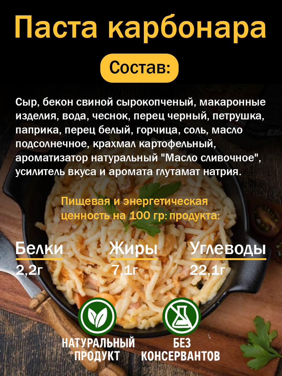 Сыр, бекон свиной сырокопченый, макаронные изделия, вода, чеснок, перец черный, петрушка, паприка, перец белый, горчица, соль, масло подсолнечное, крахмал картофельный, ароматизатор натуральный "Масло сливочное", усилитель вкуса и аромата глутамат натрия.