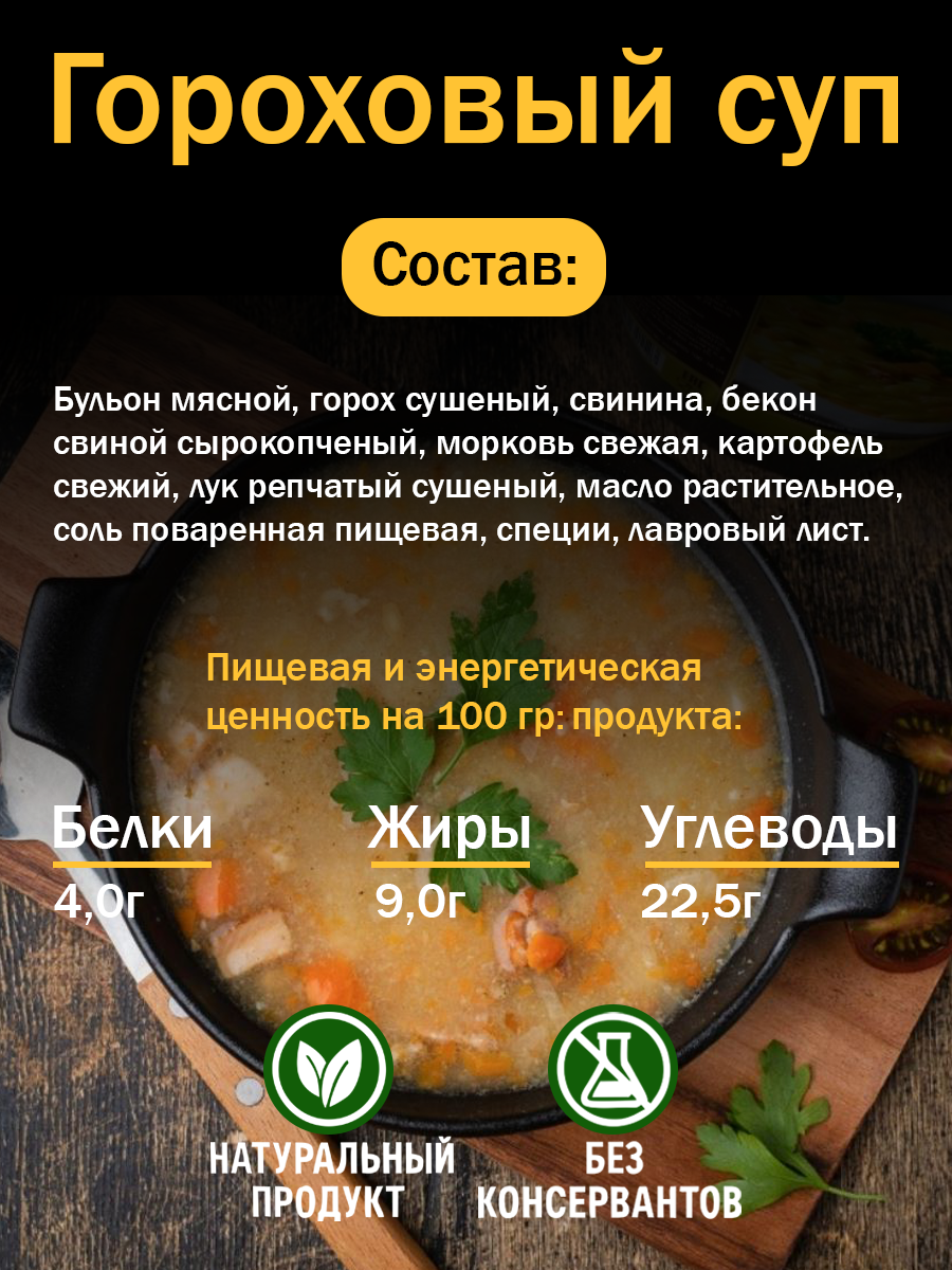 Бульон мясной, горох сушеный, свинина, бекон свиной сырокопченый, морковь свежая, картофель свежий, лук репчатый сушеный, масло растительное, соль поваренная пищевая, специи, лавровый лист.